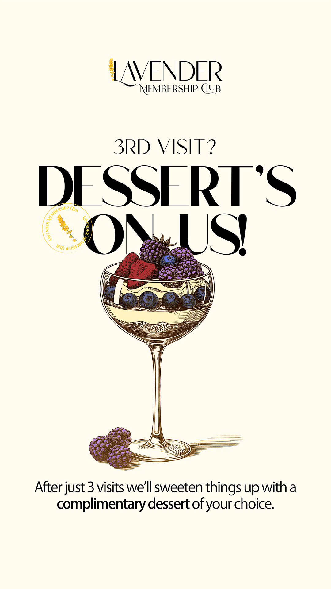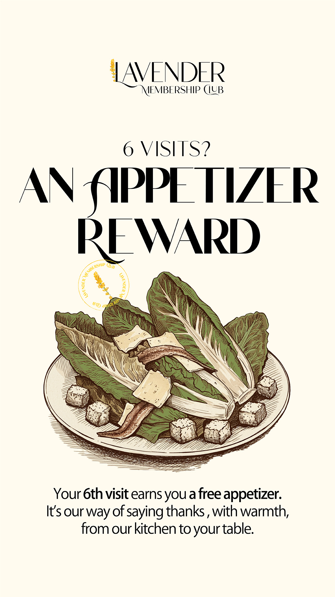 With the Lavender Membership Club, youβll earn exclusive rewards like complimentary drinks, desserts, appetizers, and entrΓ©es, just for dining with us. Simple, effortless, and beautifully rewarding.