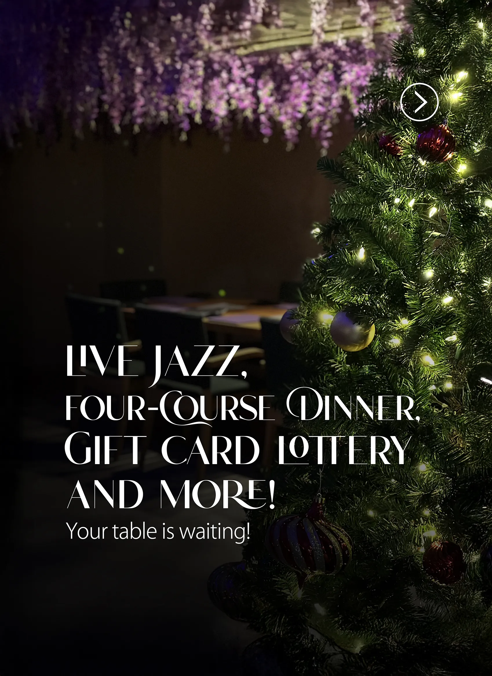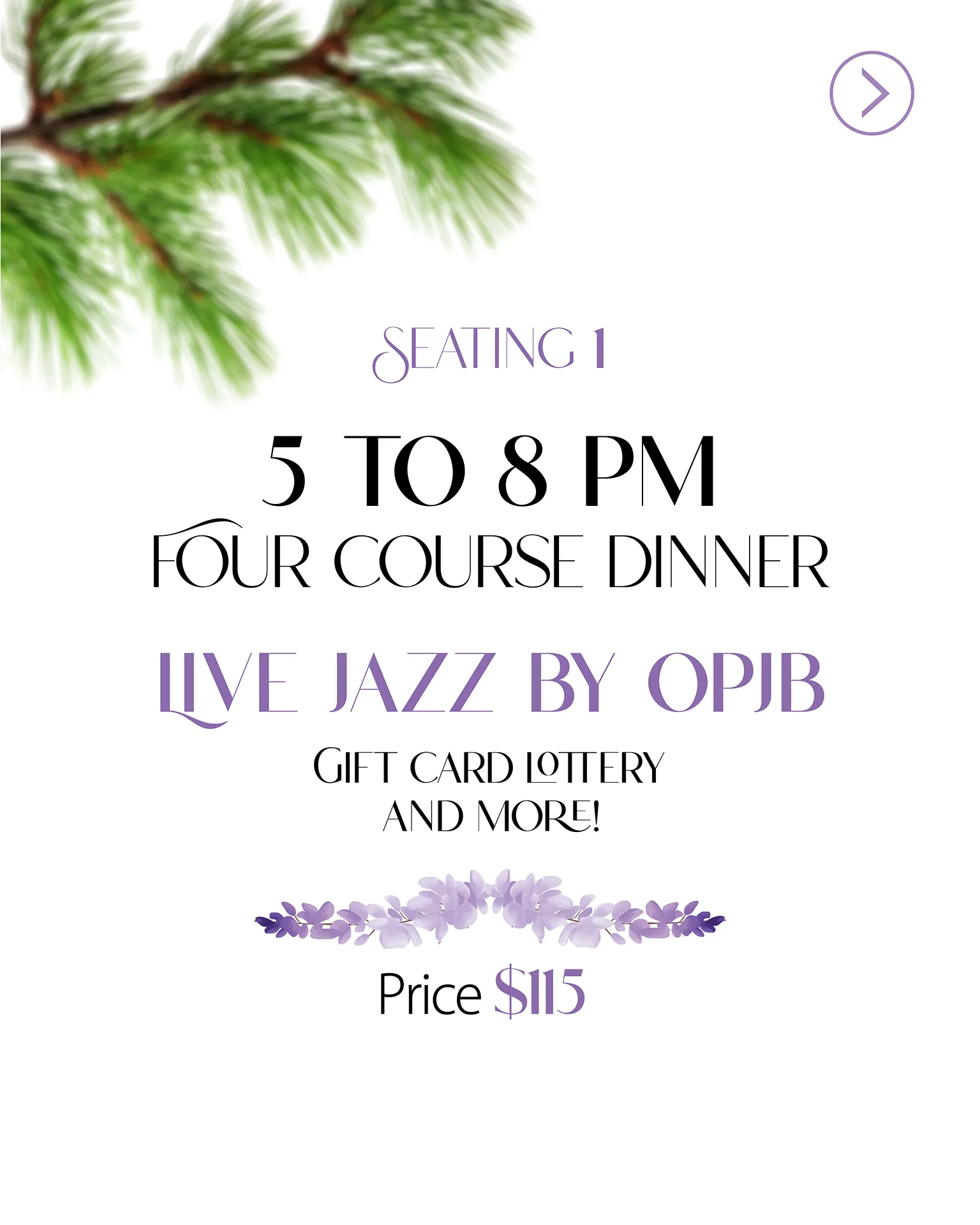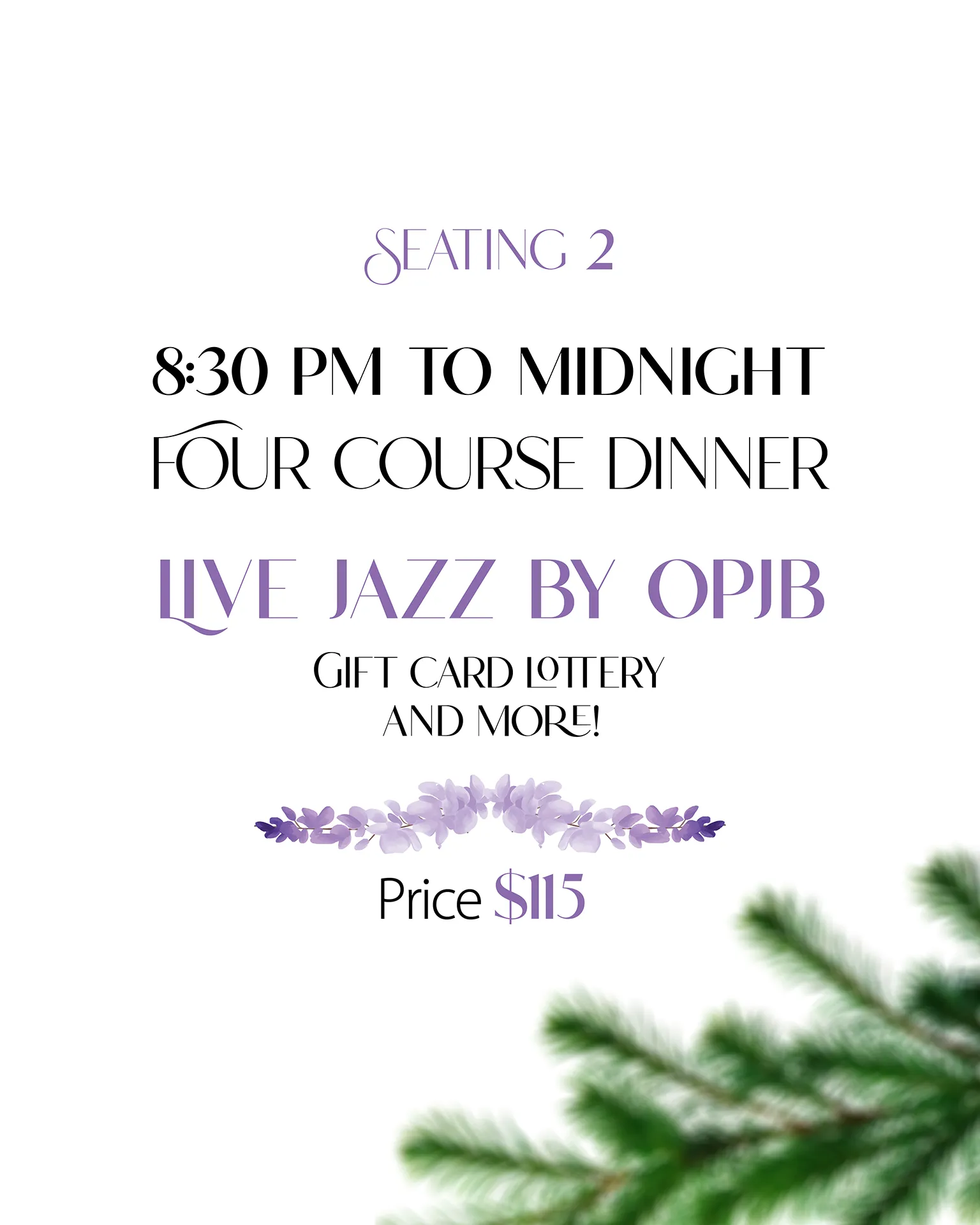 Lavender invites you to a New Yearβs Eve celebration shaped around live jazz, a refined four course dinner, and a warm, intimate atmosphere. Choose from two exclusive seatings, enjoy special surprises including our gift card lottery, and start the year with a night that feels effortless and memorable. Your table is waiting.